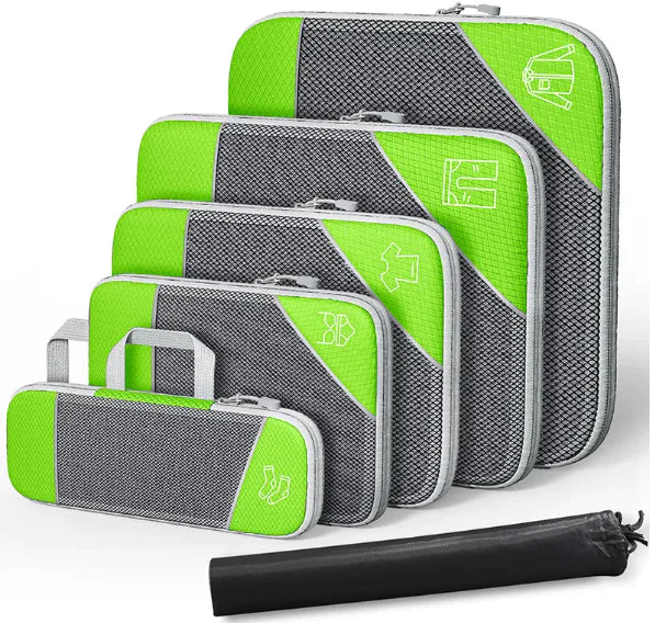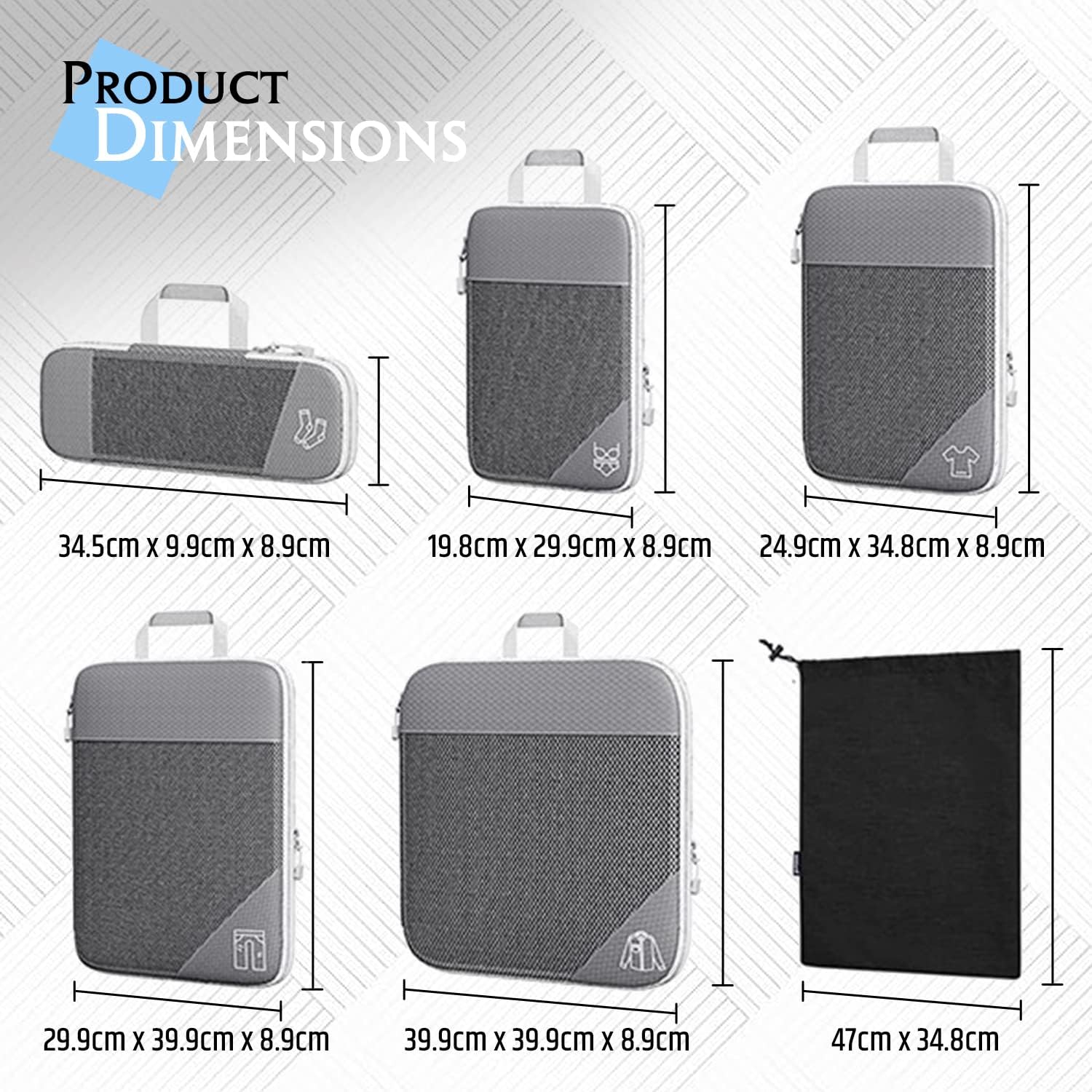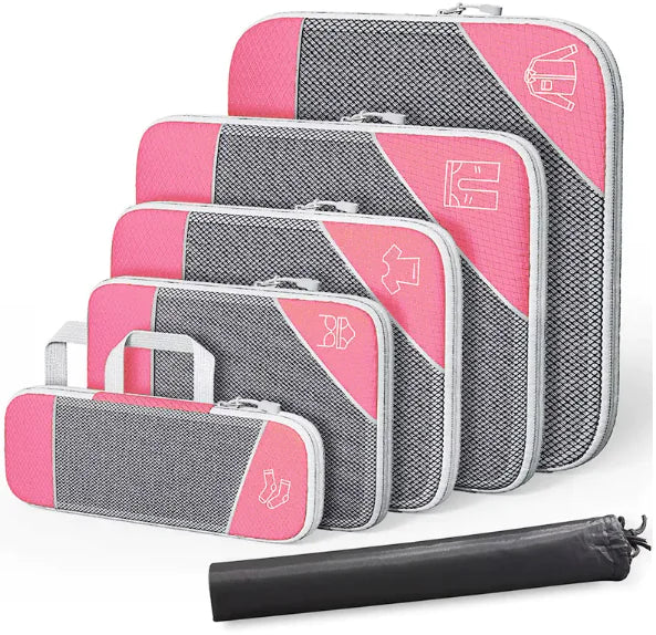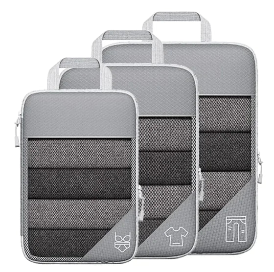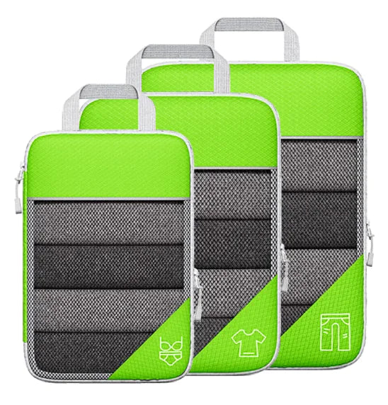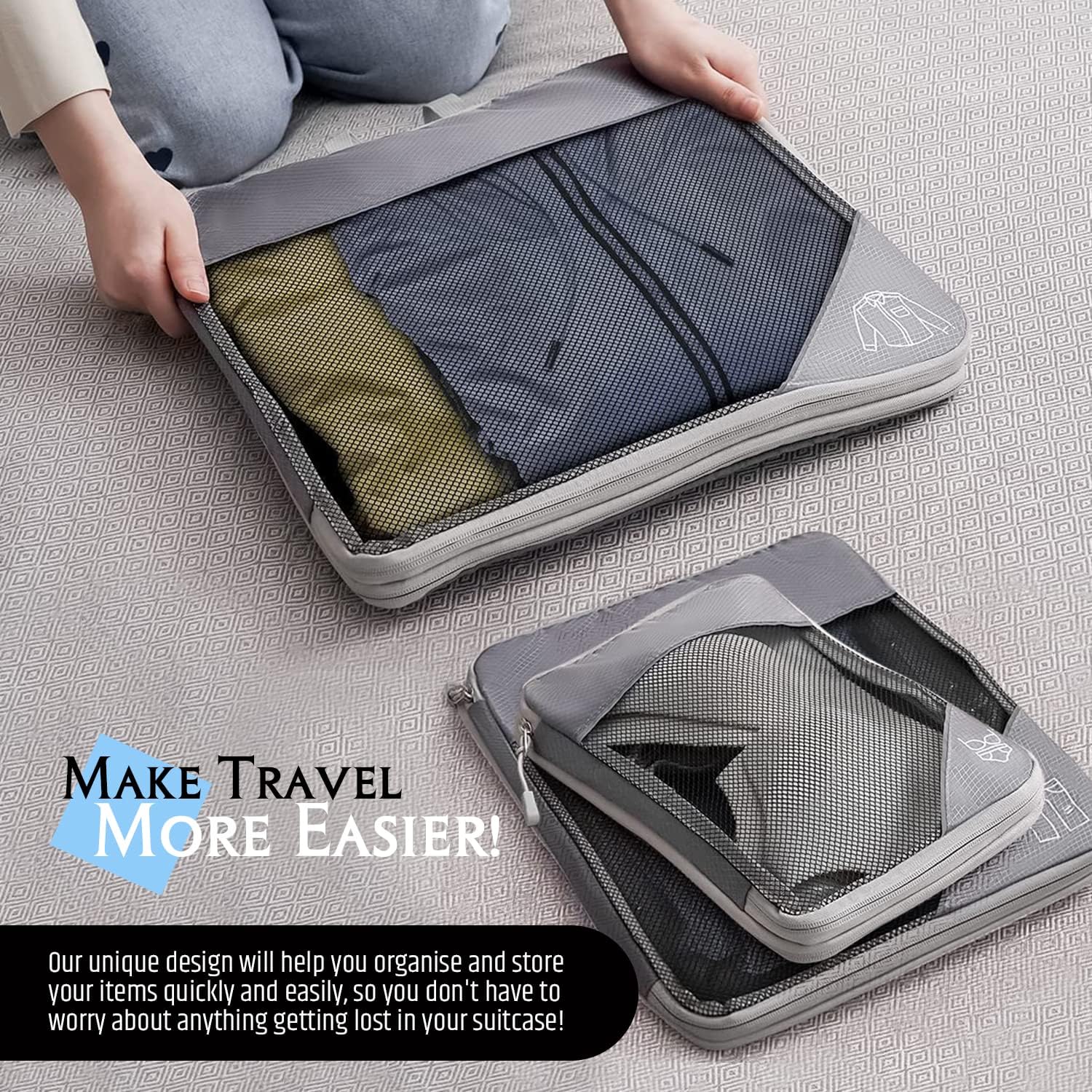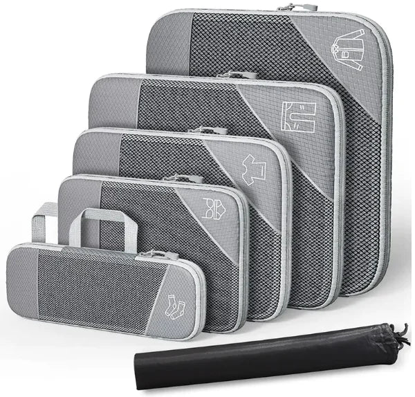 Travel Compression Packing Cubes are designed to keep your luggage organized and maximize space. This set includes compression bags and a shoe bag with a mesh visual design for easy identification.