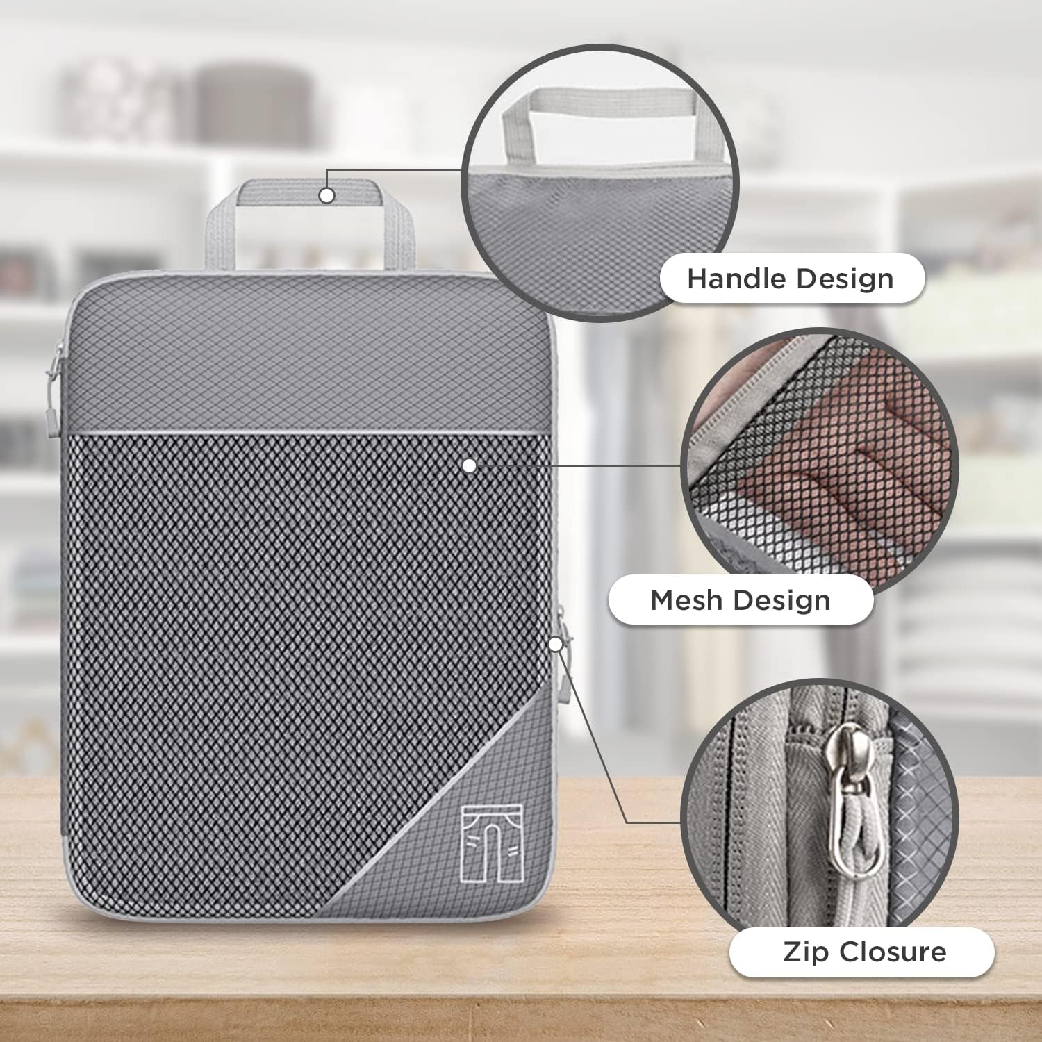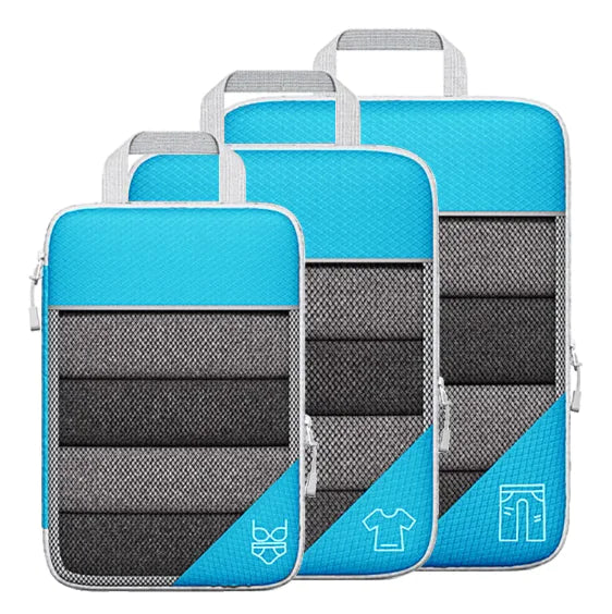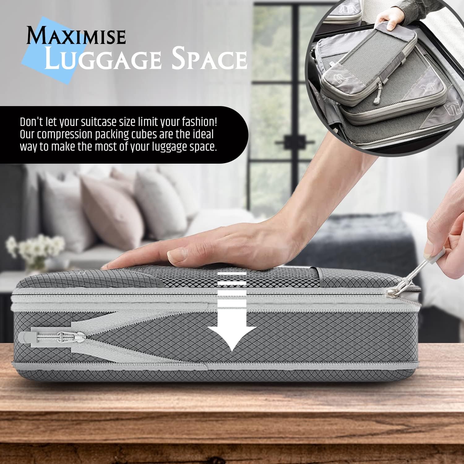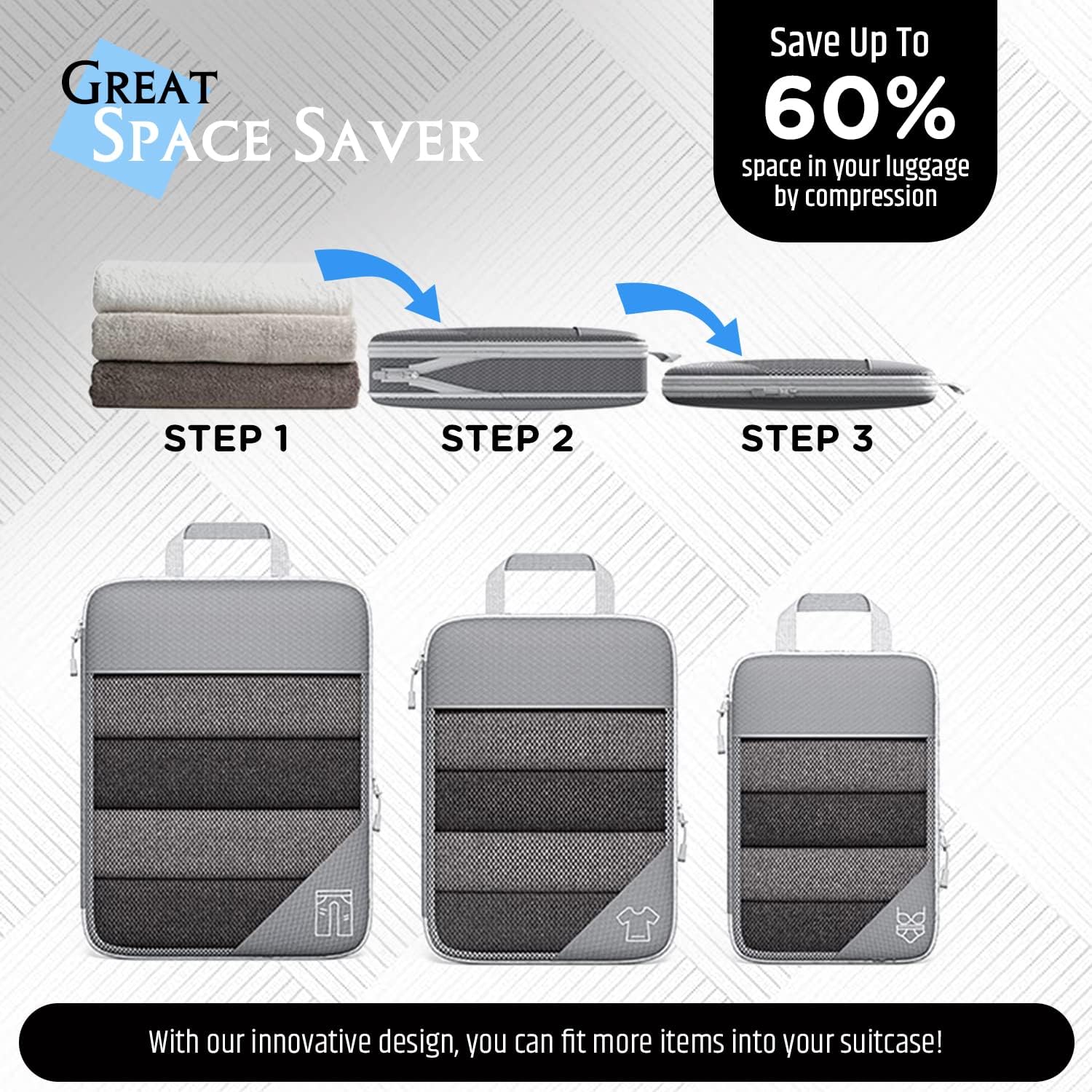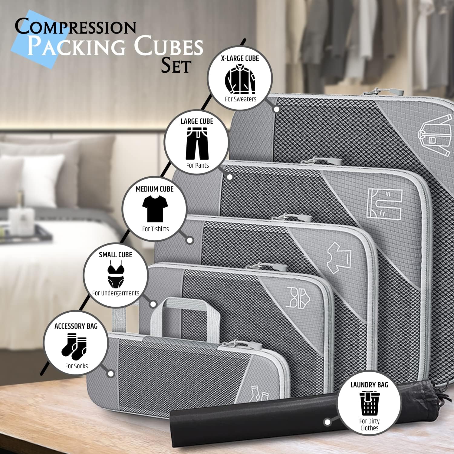 Travel Compression Packing Cubes are designed to keep your luggage organized and maximize space. This set includes compression bags and a shoe bag with a mesh visual design for easy identification.