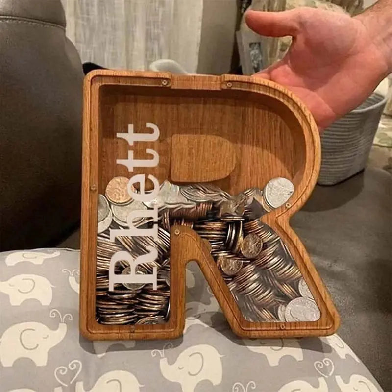 Crafted from wood, this unique coin money-saving box is both a functional jar and a delightful desktop ornament. With its charming design featuring the alphabet, it's not just a practical way to save money but also a decorative piece that brings character to your space.