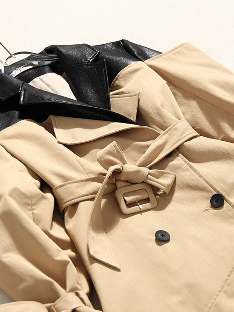 Sleek Sophistication Elevate your outerwear game with our vegan leather contrast trench coat, a perfect blend of style and sustainability. This coat features sleek lines and a modern silhouette, with vegan leather accents adding a touch of edgy sophistication. Step out in style and make a statement with this timeless wardrobe essential.