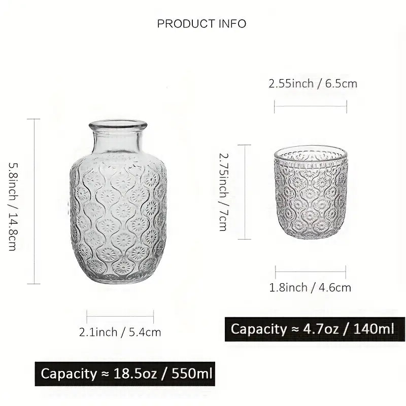 Elevate your daily routine with a Vintage Water Carafe and Glass Set, perfect for any occasion. Designed to sit gracefully on your bedroom nightstand or bedside table, this ticked glass decanter also serves as a stylish mouthwash container for your bathroom. Combining timeless elegance with practical use, it’s a must-have accessory that effortlessly keeps you refreshed and hydrated throughout the day.