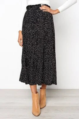 Upgrade your wardrobe with the Polka Dot Elastic High Waist Pleated Midi Skirt and experience the perfect blend of style, comfort, and sophistication!