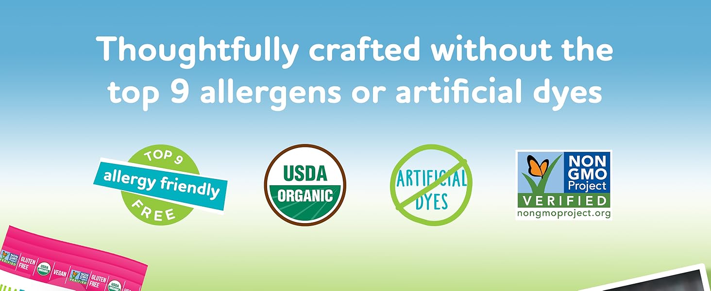 YumEarth ingredients are free from the top 9 allergens. Also free of high fructose corn syrup and artificial dyes.